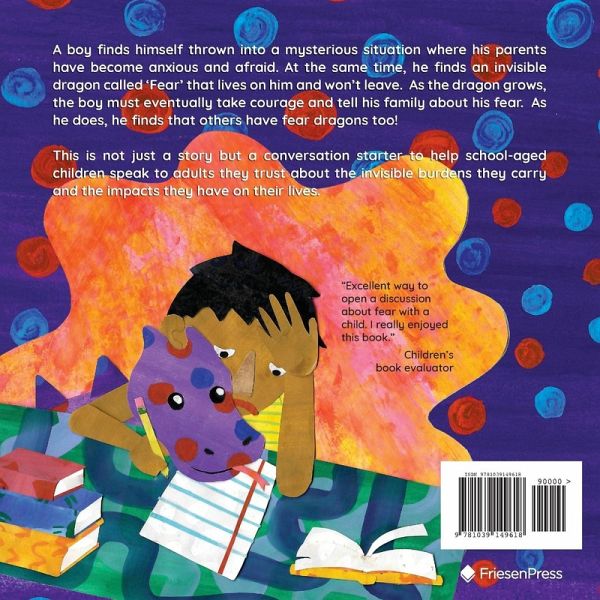A boy finds himself thrown into a mysterious situation where his parents have become anxious and afraid. At the same time, he finds an invisible dragon called 'Fear' that lives on him and won't leave. As the dragon grows, the boy must eventually take courage and tell his family about his fear. As he does, he finds that others have fear dragons too! This is not just a story but a conversation starter to help school-aged children speak to adults they trust about the invisible burdens they carry and the impacts they have on their lives.