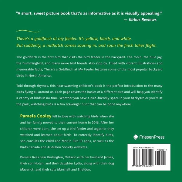 There's a goldfinch at my feeder. It's yellow, black, and white. But suddenly, a nuthatch comes soaring in, and soon the finch takes flight. The goldfinch is the first bird that visits the bird feeder in the backyard. The robin, the blue jay, the hummingbird, and many more bird friends also stop by. Filled with vibrant illustrations and memorable facts, There's a Goldfinch at My Feeder features some of the most popular backyard birds in North America. Told through rhymes, this heartwarming children's book is the perfect introduction to the many birds flying all around us. Each page covers the basics of a different bird and will help you identify a variety of birds in no time. Whether you have a bird-friendly space in your backyard or you're at the park, watching birds is a fun scavenger hunt that can be done anywhere.