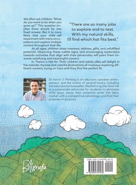 "There are so many jobsto explore and to test.With my natural skills,I'll find which hat fits best." We often ask children, "What do you want to be when you grow up?" This question implies there should be one fixed answer. But it is more likely that your child will experiment with many occupations and explore multiple careers throughout their life. At all ages, children show interests, abilities, gifts, and unfulfilled potential. Observing these subtle signs and encouraging exploration towards activities that align with their personality will point them towards satisfying and meaningful careers. In There's a Hat for That!, children and adults alike will delight in the melodic rhymes and colorful illustrations of monkeys exploring different careers, trying on hats until they find the perfect fit.
