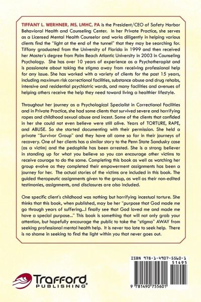 Throughout her journey as a Psychological Specialist in Correctional Facilities and in Private Practice, she had some clients that survived severe and horrifying rapes and childhood sexual abuse and incest. Some of the clients that confided in her she could not even believe were still alive. Years of TORTURE, RAPE, and ABUSE. So she started documenting with their permission. She held a private "Survivor Group" and they have all come so far in their journeys of recovery. One of her clients has a similar story to the Penn State Sandusky case (as a victim) and the pedophile has been arrested. She is a strong believer in standing up for what you believe so you can encourage other victims to receive courage to do the same. Completing this book as well as watching her group evolve as they completed their empowerment assignments has been a journey for her. The actual stories of the victims are included in this book. The guided therapeutic assignments given to the group, as well as their non-edited testimonies, assignments, and disclosures are also included. One specific client's childhood was nothing but horrifying incestual torture. She thinks that this book, when published, may be her "purpose that God made me go through years of suffering...I finally see that God loved me and made me have a special purpose..." This book is something that will not only grab your attention, but hopefully encourage the public to take the "stigma" AWAY from seeking professional mental health help. It is never too late to seek help. There is no shame in seeking to find the light within you that never goes out.