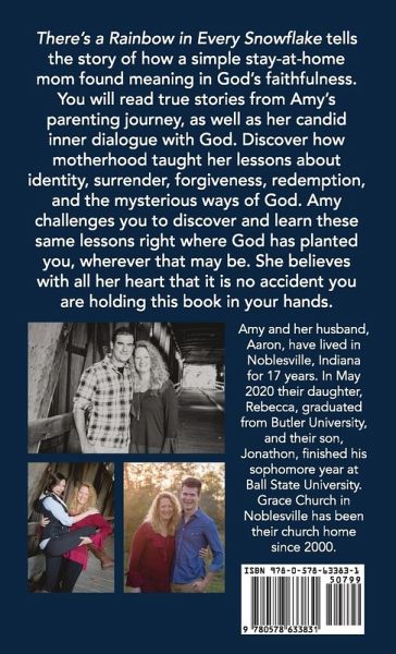 There's a Rainbow in Every Snowflake tells the story of how a simple stay-at-home mom found meaning in God's faithfulness. You will read true stories from Amy's parenting journey, as well as her candid inner dialogue with God. Discover how motherhood taught Amy lessons about identity, surrender, forgiveness, redemption, and the mysterious ways of God. The author challenges you to discover and learn these same lessons right where God has planted you, wherever that may be. She believes with all her heart that it is no accident you are holding this book in your hands.