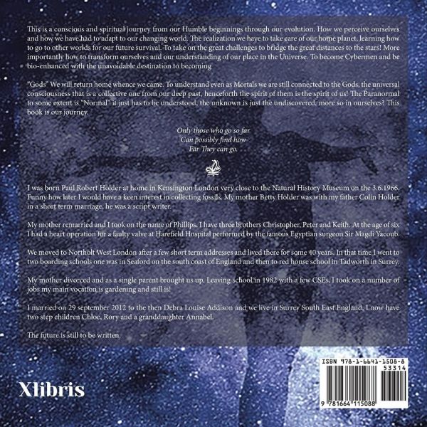 This is a conscious and spiritual journey from our Humble beginnings through our evolution. How we perceive ourselves and how we have had to adapt to our changing world. The realization we have to take care of our home planet, learning how to go to other worlds for our future survival. To take on the great challenges to bridge the great distances to the stars! More importantly how to transform ourselves and our understanding of our place in the Universe. To become Cybermen and be bio-enhanced with the unavoidable destination to becoming "Gods" We will return home whence we came. To understand even as Mortals we are still connected to the Gods, the universal consciousness that is a collective one from our deep past, henceforth the spirit of them is the spirit of us! Th e Paranormal to some extent is "Normal" it just has to be understood, the unknown is just the undiscovered, more so in ourselves? This book is our journey. Only those who go so far Can possibly find how Far They can go.