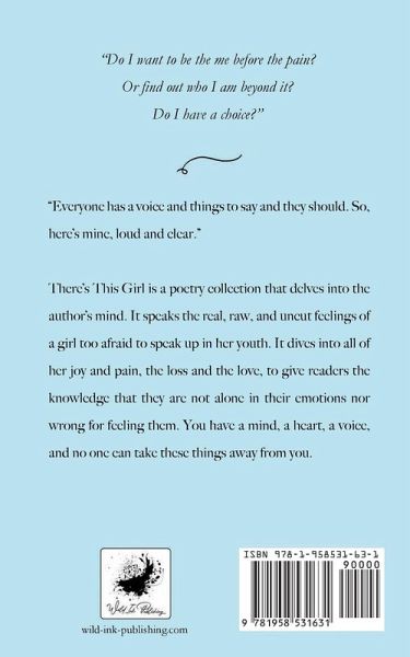 "Do I want to be the me before the pain? Or find out who I am beyond it? Do I have a choice?" "Everyone has a voice and things to say, and they should. So, here's mine, loud and clear." There's This Girl is a poetry collection that delves into the author's mind. It speaks the real, raw, and uncut feelings of a girl too afraid to speak up in her youth. It dives into all of her joy and pain, the loss and the love, to give readers the knowledge that they are not alone in their emotions nor wrong for feeling them. You have a mind, a heart, a voice, and no one can take these things away from you.