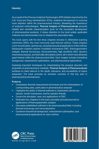 As a result of the Process Analytical Technologies (PAT) initiative launched by the U.S. Food and Drug Administration (FDA), analytical development is receiving more attention within the pharmaceutical industry. Illustrating the importance of analytical methodologies, Thermal Analysis of Pharmaceuticals presents reliable and versatile characterization tools for the successful development of pharmaceutical products. It draws attention to the most widely applicable methods and demonstrates how to interpret the associated data. The book opens with the first three chapters devoted to differential scanning calorimetry (DSC), the most commonly used thermal method. These chapters cover the principles, optimal use, and pharmaceutical applications of the method. Subsequent chapters explore modulated temperature DSC, thermogravimetric analysis, thermal microscopy, microcalorimetry, high sensitivity DSC, dynamic mechanical analysis, and thermally stimulated current, all of which have attracted great interest within the pharmaceutical field. The chapters include theoretical background, measurement optimization, and pharmaceutical applications of each technique. Exploring important techniques for characterizing the physical structure and properties of pharmaceutical materials, Thermal Analysis of Pharmaceuticals achieves an ideal balance in the depth, relevance, and accessibility of topics presented. The book provides an excellent overview of this key area in pharmaceutical development.