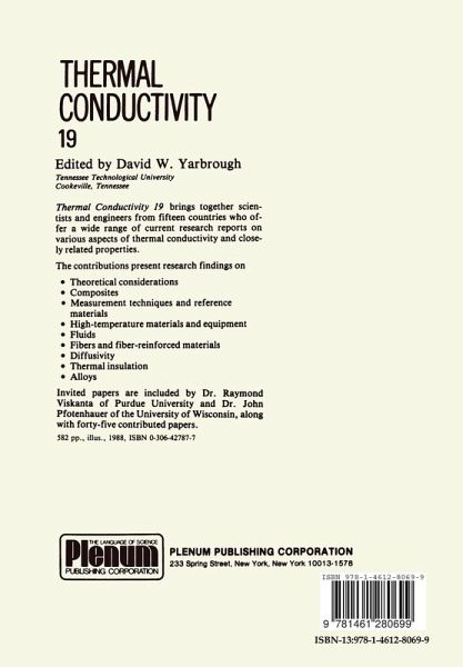The International Thermal Conductivity Conference was started in 1961 with the initiative of Mr. Charles F. Lucks and grew out of the needs of researchers in the field. The Conferences were held annually from 1961 to 1973 and have been held biennially since 1975 when our Center for Informa tion and Numerical Data Analysis and Synthesis (CINDAS) of Purdue University became the Permanent Sponsor of the Conferences. -These Conferences provide a broadly based forum for researchers actively working on the thermal con ductivity and closely related properties to convene on a regular basis to exchange…mehr