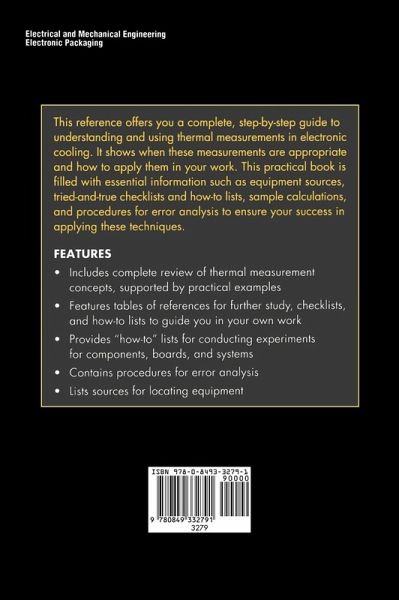 Filled with explanations, step-by- step instructions, and examples, this handbook focuses on real-world considerations and applications of thermal measurement methods in electronics cooling. This practical reference covers all aspects of thermal characterization in electronics cooling and thermal management. The first part of the book introduces the concept of electronics cooling and its associated thermal phenomenon and explains why experimental investigation is required. Subsequent chapters explain methods of measuring different parameters. Sources for locating needed equipment, tables, checklists, and to-do lists are included. Sample calculations and methodologies for error analysis ensure that you can put this valuable information to use in your work. TOC:Electronics Cooling and the Need for Experimentation, K. Azar. Uncertainty Analysis, R.J. Moffatt. Similitude in Electronics Cooling, M.T. Boyle. Measuring Velocity in Electronics Systems, J. Foss, C. Wark, and D. Williams. Temperature Measurement in Electronics Cooling, J. Sweet. Measuring Pressure in Electronics Systems, G.A. Pender. Measuring Thermal Conductivity and Diffusivity, J.E. Graebner. Heat Flux Measurements: Theory and Applications, N.R. Keltner. Wind Tunnel Design, R.V. Westphal. Flow Visualization Methods and their Application in Electronics Systems, S.V. Garimella. Principles of Component Characterization, J.W. Sofia. Acoustical Noise Measurement and Control in Electronics Systems, G.C. Maling and D.M. Yeager. Index.