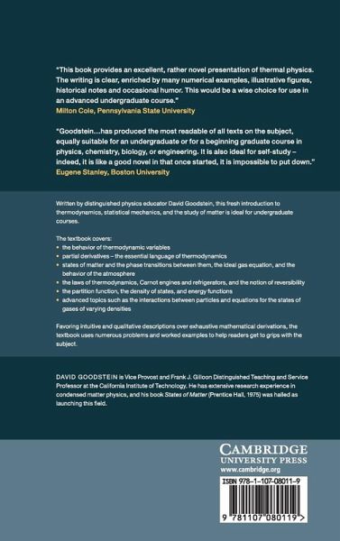 Written by distinguished physics educator David Goodstein, this fresh introduction to thermodynamics, statistical mechanics, and the study of matter is ideal for undergraduate courses. The textbook looks at the behavior of thermodynamic variables and examines partial derivatives - the essential language of thermodynamics. It also explores states of matter and the phase transitions between them, the ideal gas equation, and the behavior of the atmosphere. The origin and meaning of the laws of thermodynamics are then discussed, together with Carnot engines and refrigerators, and the notion of reversibility. Later chapters cover the partition function, the density of states, and energy functions, as well as more advanced topics such as the interactions between particles and equations for the states of gases of varying densities. Favoring intuitive and qualitative descriptions over exhaustive mathematical derivations, the textbook uses numerous problems and worked examples to help readers get to grips with the subject.