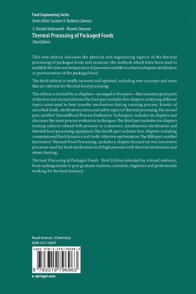 This edition is formed by 22 chapters-arranged in five parts-that maintain great parts of the first and second editionsThe First part includes five chapters analyzing different topics associated to heat transfer mechanism during canning process, kinetic of microbial death, sterilization criteria and safety aspect of thermal processing.The second part, entitled Thermal Food Process Evaluation Techniques, includes six chapters and discusses the main process evaluation techniques.The third part includes six chapters treating subjects related with pressure in containers, simultaneous sterilization and thermal food processing equipment.The fourth part includes four chapters including computational fluid dynamics and multi-objective optimization.The fifth part, entitled Innovative Thermal Food Processing, includes a chapter focused on two innovative processes used for food sterilization such high pressure with thermal sterilization and ohmic heating.