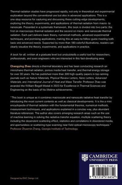 Part I. General Principles of Thermal Radiation and Applications: 1. Fundamentals of thermal radiation 2. Radiative transfer equation 3. Numerical methods for solving radiative transfer equation 4. Experimental techniques for macroscale thermal radiative properties 5. Applications of macroscale thermal radiation Part II. Micro/Nanoscale Thermal Radiation: 6. An overview of micro/nanoscale thermal radiation 7. Theoretical fundamentals of micro/nanoscale thermal radiation 8. Numerical methods for micro/nanoscale thermal radiation 9. Experimental techniques for micro/nanoscale thermal radiation 10. Manipulation of thermal radiative properties in micro/nanoscale 11. Applications of micro/nanoscale thermal radiation References Index.