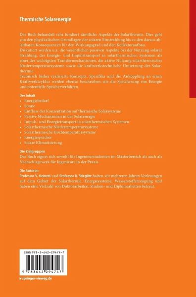 Das Buch behandelt sehr fundiert sämtliche Aspekte der Solarthermie. Dies geht von den physikalischen Grundlagen der solaren Einstrahlung bis zu den daraus ableitbaren Konsequenzen für den Wirkungsgrad und den Kollektoraufbau.