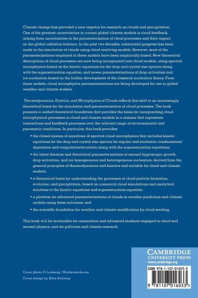 Thermodynamics, Kinetics and Microphysics of Clouds presents a unified theoretical foundation that provides the basis for incorporating cloud microphysical processes in cloud and climate models. In particular, the book provides: . A theoretical basis for understanding the processes of cloud particle formation, evolution and precipitation, with emphasis on spectral cloud microphysics based on numerical and analytical solutions of the kinetic equations for the drop and crystal size spectra along with the supersaturation equation . The latest detailed theories and parameterizations of drop and crystal nucleation suitable for cloud and climate models derived from the general principles of thermodynamics and kinetics . A platform for advanced parameterization of clouds in weather prediction and climate models . The scientific foundation for weather and climate modification by cloud seeding. This book will be invaluable for researchers and advanced students engaged in cloud and aerosol physics, and air pollution and climate research.