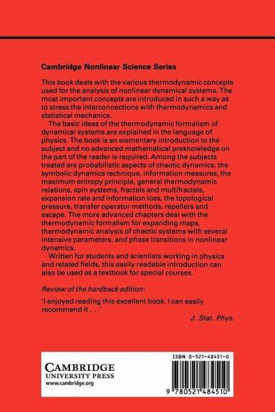 This book deals with the various thermodynamic concepts used for the analysis of nonlinear dynamical systems. The most important invariants used to characterise chaotic systems are introduced in a way that stresses the interconnections with thermodynamics and statistical mechanics. Among the subjects treated are: probabilistic aspects of chaotic dynamics; the symbolic dynamics technique; information measures, the maximum entropy principle; general thermodynamic relations; spin systems; fractals and multifractals; expansion rate and information loss; the topological pressure; transfer operator methods; and repellers and escape. The more advanced chapters deal with the thermodynamic formalism for expanding maps, the thermodynamic analysis of chaotic systems with several intensive parameters and phase transitions in nonlinear dynamics.