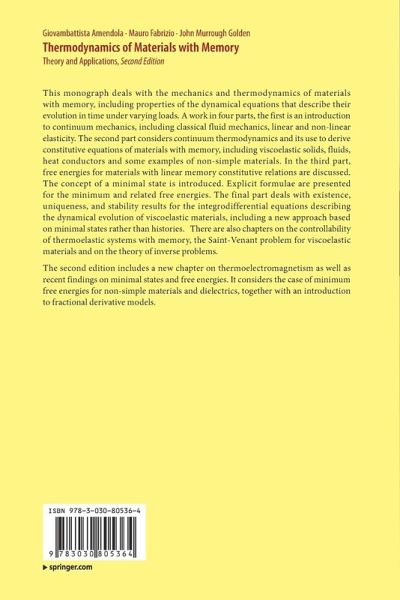 This monograph deals with the mechanics and thermodynamics of materials with memory, including properties of the dynamical equations that describe their evolution in time under varying loads. A work in four parts, the first is an introduction to continuum mechanics, including classical fluid mechanics, linear and non-linear elasticity. The second part considers continuum thermodynamics and its use to derive constitutive equations of materials with memory, including viscoelastic solids, fluids, heat conductors and some examples of non-simple materials. In the third part, free energies for materials with linear memory constitutive relations are discussed. The concept of a minimal state is introduced. Explicit formulae are presented for the minimum and related free energies. The final part deals with existence, uniqueness, and stability results for the integrodifferential equations describing the dynamical evolution of viscoelastic materials, including a new approach based on minimal states rather than histories. There are also chapters on the controllability of thermoelastic systems with memory, the Saint-Venant problem for viscoelastic materials and on the theory of inverse problems. The second edition includes a new chapter on thermoelectromagnetism as well as recent findings on minimal states and free energies. It considers the case of minimum free energies for non-simple materials and dielectrics, together with an introduction to fractional derivative models.