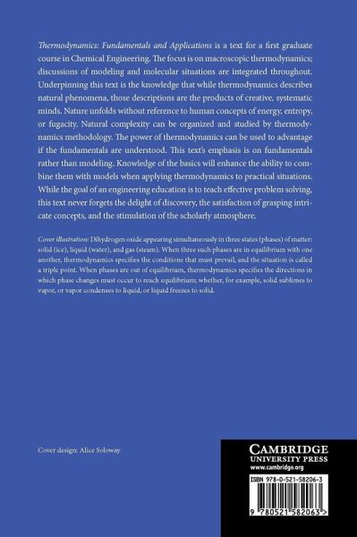 Thermodynamics: Fundamentals and Applications is a 2005 text for a first graduate course in Chemical Engineering. The focus is on macroscopic thermodynamics; discussions of modeling and molecular situations are integrated throughout. Underpinning this text is the knowledge that while thermodynamics describes natural phenomena, those descriptions are the products of creative, systematic minds. Nature unfolds without reference to human concepts of energy, entropy, or fugacity. Natural complexity can be organized and studied by thermodynamics methodology. The power of thermodynamics can be used to advantage if the fundamentals are understood. This text's emphasis is on fundamentals rather than modeling. Knowledge of the basics will enhance the ability to combine them with models when applying thermodynamics to practical situations. While the goal of an engineering education is to teach effective problem solving, this text never forgets the delight of discovery, the satisfaction of grasping intricate concepts, and the stimulation of the scholarly atmosphere.