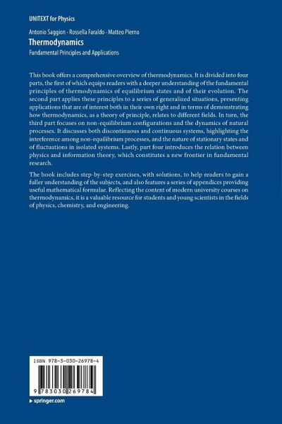 This book offers a comprehensive overview of thermodynamics. It is divided into four parts, the first of which equips readers with a deeper understanding of the fundamental principles of thermodynamics of equilibrium states and of their evolution. The second part applies these principles to a series of generalized situations, presenting applications that are of interest both in their own right and in terms of demonstrating how thermodynamics, as a theory of principle, relates to different fields. In turn, the third part focuses on non-equilibrium configurations and the dynamics of natural processes. It discusses both discontinuous and continuous systems, highlighting the interference among non-equilibrium processes, and the nature of stationary states and of fluctuations in isolated systems. Lastly, part four introduces the relation between physics and information theory, which constitutes a new frontier in fundamental research.