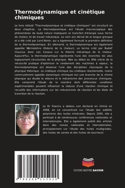 Le livre intitulé "Thermodynamique et cinétique chimiques" est structuré en deux chapitres. La thermodynamique est l'étude macroscopique des phénomènes de toute nature impliquant un transfert d'énergie sous forme de chaleur et de travail mécanique. Le nom est dérivé de la langue grecque et a été créé par Lord Kelvin, qui a également formulé la première définition de la thermodynamique. En allemand, la thermodynamique est également appelée Wärmelehre (théorie de la chaleur), un terme créé par Rudolf Clausius dans ses travaux sur la théorie mécanique de la chaleur. Aujourd'hui, la thermodynamique représente l'une des branches les plus logiquement structurées de la physique. Née au début du XIXe siècle de la nécessité pratique d'optimiser le rendement des machines à vapeur, la thermodynamique est devenue l'une des disciplines classiques de la physique théorique. La cinétique chimique (ou cinétique réactionnelle, moins communément appelée dynamique chimique) est une branche de la chimie physique qui étudie la vitesse et le mécanisme des processus chimiques. Elle comprend l'étude de la manière dont différentes conditions expérimentales peuvent influencer la vitesse d'une réaction chimique et recueille des informations sur les mécanismes de réaction et les états de transition de la réaction.