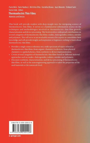 This book will provide readers with deep insight into the intriguing science of thermoelectric thin films. It serves as a fundamental information source on the techniques and methodologies involved in thermoelectric thin film growth, characterization and device processing. This book involves widespread contributions on several categories of thermoelectric thin films: oxides, chalcogenides, iodates, nitrides and polymers. This will serve as an invaluable resource for experts to consolidate their knowledge and will provide insight and inspiration to beginners wishing to learn about thermoelectric thin films.