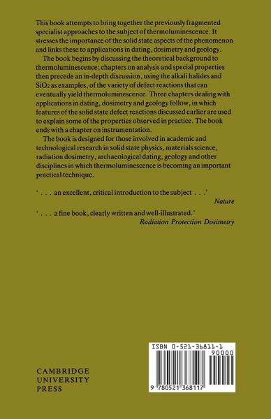 McKeever gives us a comprehensive survey of thermoluminescence, an important, versatile, and widely-used experimental technique. Bringing together previously isolated specialized approaches, he stresses the importance of the solid state aspects of the phenomenon and links these to applications in dating, dosimetry, and geology. The book contains chapters on analysis and special properties, on instrumentation, and on the variety of defect reaction--using the alkali halides and SiO2 as examples--that can take place within a material to yield thermoluminescence. Three chapters concerning applications discuss the features of the solid state reactions to explain some of the properties observed in practice.