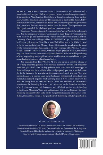 This book will help you understand that, yes, you can study dog poetry, become the Minnesota Twins closer, run for president of the United States, become a Franciscan friar in Albuquerque, put oranges in a circle, teach courses in conflicting political theory at the University of Idaho, attend Mass literally underground in a subterranean cathedral hundreds of feet below the desert floor, play no pads tackle football on Boise State's blue turf, write tracts while sunbathing at the top of Namur's castle in summertime, discuss constitutional originalism while getting a back rub, and fight a lot, I mean tons, tons see: a cornucopia, no, a plethora, nay, an overabundance, of bad, super, super bad guys bent on well...yes, the, yeah, the standard take over the world and rule everyone thing, you know, that, but, wait, but this time: nuclear weapons are not subtexted background chatter but out in the open and this time: you get to travel to Illinois, Italy, and Iceland's Blue Lagoon in one footnote and this time: the main love story isn't some stock photo, twenty something couple in a penny dreadful Saturday afternoon movie you watch with a lukewarm latte on a well-worn couch in Lower Manhattan your spirits lower than the elevation itself. No, here it's a 60-something power couple, she extreme left, he extreme right, they, together, perhaps more explosive than the bombs themselves. This book will help you understand that you can do, or, at least try to do, or, failing that, with one-hundred percent certitude, read about others doing these things. You have free will, do you understand that? Of course, this also means that it is your fault. Don't add to your long list of mistakes by missing this book. For Thermonuclear Mirth is unique on the fiction landscape, Catholic and otherwise, today. In an age where "fiction" invariably means dragons, knights, ladies and endless webs of fantastical fakeries, one will not find a single example of such things in this book. Thermonuclear Mirth is a wholly fictional book of real life in the future, a future as it might become, not as it can never be, with a persistent question of what can be done in response, by applying eternal truths, running from cover to cover. The book is at times sincere, at times absurd, at times extremely absurd; it will make you cry, laugh until you cry, inspire you to learn at least one foreign language, and make you feel guilty, and ashamed, if you cannot do ten pull-ups, jump up and touch 9 feet, and run a respectable mile; it is at times profane, vulgar, and base, but, unlike scores of books for whom those markers are the goal as well, here such things are only present so as to show the horrid reality of sin so as to lead readers to a clearer, and long lasting, appreciation of the narrow path towards the Good, the True, the Beautiful. The "reality of sin;" so too the reality of beer, politics at Thanksgiving dinner, Rottweilers, Lake Zurich, Rhode Island Red Hens, ad infinitum. This because Thermonuclear Mirth is a book about real life; the messiness of it, yes, down to the very bottom of the well; but the hope, rather the surety, of solutions to the messiness and a path to authentic happiness.