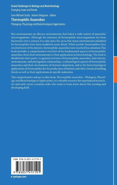Hot environments are diverse environments that habor a wide variety of anaerobic microorganisms. Although the existence of thermophilic microorganisms has been known for over a century, it is only since the 1970s that warm environments inhabited by thermophiles have been studied in more detail. While aerobic thermophiles have received most of the interest, thermophilic anaerobes have received less attention. This book provides a comprehensive overview of the fundamental aspects of thermophilic anaerobes, from their environments to their applications in biotechnology. The book is divided…mehr