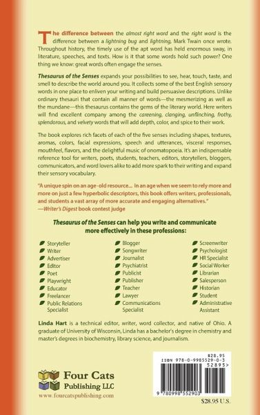 A unique reference tool for writers and students to expand their sensory vocabulary The difference between the almost right word and the right word is the difference between a lightning bug and lightning, Mark Twain once wrote. Throughout history, the timely use of the apt word has held enormous sway, in literature, speeches, and texts. How is it that some words hold such power? One thing we know: great words often engage the senses. Thesaurus of the Senses expands your possibilities to see, hear, touch, taste, and smell to describe the world around you. It collects some of the best English sensory words in one place to enliven your writing and build persuasive descriptions. Unlike ordinary thesauri that contain all manner of words-the mesmerizing as well as the mundane-this thesaurus contains the gems of the literary world. Here writers will find excellent company among the careening, clanging, unflinching, frothy, splendorous, and velvety words that will add depth, color, and spice to their work. The book explores rich facets of each of the five senses including shapes, textures, aromas, colors, facial expressions, speech and utterances, visceral responses, mouthfeel, flavors, and the delightful music of onomatopoeia. Also included are exercises to help writers connect with the senses, along with full word and subject indexes. It's an indispensable reference tool for writers, poets, students, teachers, editors, storytellers, bloggers, communicators, and word lovers alike to add more spark to their writing and expand their sensory vocabulary. "A unique spin on an age-old resource...In an age when we seem to rely more and more on just a few hyperbolic descriptors, this book offers writers, professionals, and students a vast array of more accurate and engaging alternatives." -Writer's Digest book contest judge