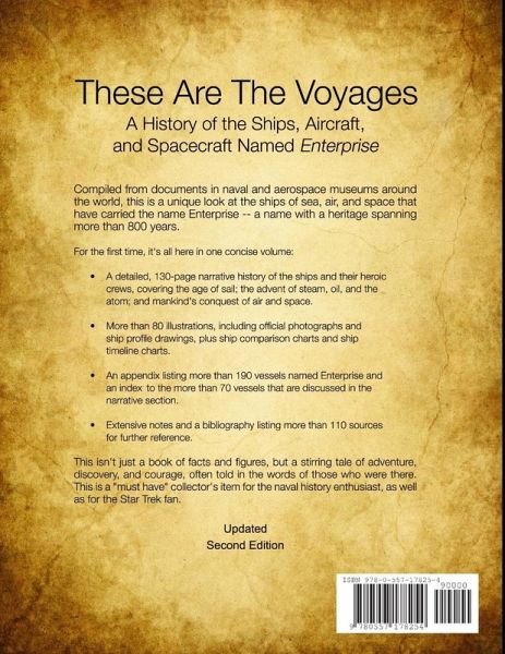 Compiled from documents in naval and aerospace museums around the world, this is a unique look at the ships of sea, air, and space that have carried the name Enterprise -- a name with a heritage spanning more than 800 years. For the first time, it's all here in one concise volume: o A detailed, 130-page narrative history of the ships and their heroic crews. o More than 80 illustrations, including official photographs and ship profile drawings. o An appendix listing more than 190 vessels named Enterprise. o Extensive notes and a bibliography listing more than 110 sources for further reference. This isn't just a book of facts and figures, but a stirring tale of adventure, discovery, and courage, often told in the words of those who were there. This revised 2nd edition updates the stories of the naval vessels through the deactivation of the aircraft carrier USS Enterprise (CVN-65) and the latest adventures of the starships Enterprise. Come and relive the epic voyages!