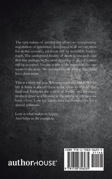 The very nature of inevitability allows no compromise, negotiation or ignorance. Acceptance is all we can strive for in this scenario, yet it can still be incredibly hard to reach. The undisputed finality of death is one such case that may perhaps be the most daunting of all, yet... must still be accepted. No one wants to die miserable. No one wants to die alone. No one wants to die feeling they could have done more. This is a story for you. Whoever reads my words. Whilst life is finite it doesn't have to be spent in fear of that final end. Embrace the notion of finality and live every moment prior as a blessing in the strongest emotion we have - love. Love for family, love for friends, love for a special someone. Love is what makes us happy, And helps us die complete.