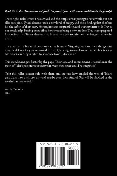 Book #2 in the "Dream Series" finds Trey and Tylar with a new addition to the family! That's right, Baby Preston has arrived and the couple are adjusting to her arrival! But not all is rosy pink. Tylar's dreams reach a new level of creepy, and she is finding that she fears for the safety of their baby. Her nightmares are puzzling, and sharing them with Trey is not much help. Passing them off to her stress at being a new mother, Trey is not prepared for the fact that Tylar's dreams may in fact be a premonition of the danger that awaits them. They marry in a beautiful ceremony at his home in Virginia, but soon after, things start to get real. Even Trey comes to realize that Tylar's nightmares have substance, but is it too late once their baby is taken by someone from Tylar's past? This installment gets better by the page. Their love and commitment is tested once the truth of Tylar's past starts to unravel in ways they never could've imagined!' Take this roller coaster ride with them and see just how tangled the web of Tylar's past plays into their present--and maybe even their future! You will be shocked at the revelations that unfold! Adult Content 18+