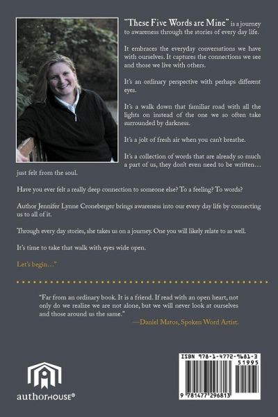 "These Five Words are Mine" is a journey to awareness through the stories of every day life. It embraces the everyday conversations we have with ourselves. It captures the connections we see and those we live with others. It's an ordinary perspective with perhaps different eyes. It's a walk down that familiar road with all the lights on instead of the one we so often take surrounded by darkness. It's a jolt of fresh air when you can't breathe. It's days with a notebook, but not writing so you miss out on what you can't see when your head is down. The words are already so much a part of us, they don't even need to be written. Just felt. Have you ever felt a really deep connection to someone else? To a feeling? To words? Author Jen Croneberger brings awareness into our every day life by connecting us to all of it. Through every day stories, she takes us on a journey. One you will likely relate to as well. It's time to take that walk with eyes wide open. Let's begin..." Review: "Far from an ordinary book. It is a friend. If read with an open heart, not only do we realize we are not alone, but we will never look at ourselves and those around us the same."--Daniel Matos, Spoken Word Artist.