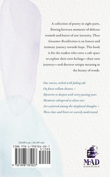 A collection of poetry in eight parts, flowing between moments of delicate warmth and bursts of raw intensity. These Gossamer Recollections is an honest and intimate journey towards hope. This book is for the readers who crave a safe space to explore their own feelings-their own journeys-and discover unique meaning in the beauty of words. Our stories, etched with fading inkOn finest vellum sheaves-Mysteries to deepen with every passing year;Memories whispered to silent earsAre scattered among the misplaced thoughts-These clues and hints we scarcely understand.