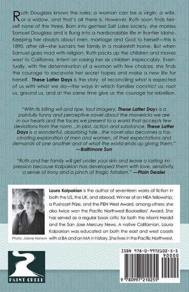 "You listen to me, my girl" Ruth Douglass tells her daughter. "You've got three choices in this world, and only three. A woman can be a virgin, a wife, or a widow, and that's all there is." Ruth Douglass should know. The central character in Laura Kalpakian's novel of three generations of Mormons, Ruth soon finds herself neither wife, widow, nor virgin. Born into genteel Salt Lake society, she marries Samuel Douglass and is flung into a hardscrabble life in frontier Idaho. Keeping her doubts about men, marriage and God to herself-this is 1890, after all-she sustains her family in a makeshift home. But when Samuel goes mad with religion, Ruth packs up the children and moves west to California. Intent on raising her six children impeccably, Ruth is nonetheless haunted by the lie that she told and the lie that she lives. Eventually, with the determination of a woman with few choices, she finds the courage to excavate her secret hopes and make a new life for herself. She presides over a loving and contentious cast: Dr. Lucius Tipton, the convivial cigar-smoking atheist who falls in love with Ruth; her rich, small-minded brother, Albert, who refuses to help her; Kitty, the daughter-in-law who defies the church, the community and the family bond. And the children-some of whom never lose faith, some of whom never find it-especially Eden, the bright star. These Latter Days is about reconciling what is expected of us with what we do. The Douglasses discover that within the bounds imposed by their world and their church, it is hard to do right; sometimes they must do what their hearts tell them. "It's that simple. And that hard," Ruth declares. Told candidly and compellingly, this story shows the ways in which families constrict us, root us, ground us, and at the same time give us the courage for rebellion.