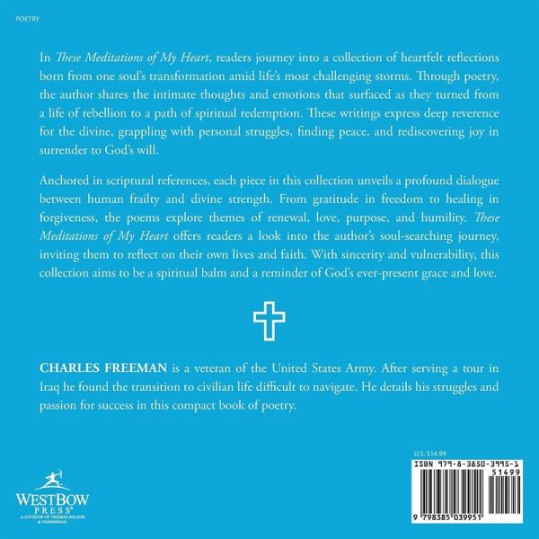 In These Meditations of My Heart, readers journey into a collection of heartfelt reflections born from one soul's transformation amid life's most challenging storms. Through poetry, the author shares the intimate thoughts and emotions that surfaced as they turned from a life of rebellion to a path of spiritual redemption. These writings express deep reverence for the divine, grappling with personal struggles, finding peace, and rediscovering joy in surrender to God's will. Anchored in scriptural references, each piece in this collection unveils a profound dialogue between human frailty and divine strength. From gratitude in freedom to healing in forgiveness, the poems explore themes of renewal, love, purpose, and humility. These Meditations of My Heart offers readers a look into the author's soul-searching journey, inviting them to reflect on their own lives and faith. With sincerity and vulnerability, this collection aims to be a spiritual balm and a reminder of God's ever-present grace and love.