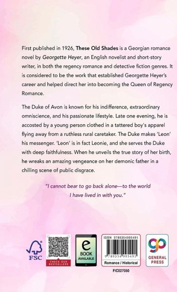First published in 1926, 'These Old Shades' is a Georgian romance novel by Georgette Heyer, an English novelist and short-story writer, in both the regency romance and detective fiction genres. It is considered to be the work that established Georgette Heyer's career and helped direct her into becoming the Queen of Regency Romance. The Duke of Avon is known for his indifference, extraordinary omniscience, and his passionate lifestyle. Late one evening, he is accosted by a young person clothed in a tattered boy's apparel flying away from a ruthless rural caretaker. The Duke makes 'Leon' his messenger. 'Leon' is in fact Leonie, and she serves the Duke with deep faithfulness. When he unveils the true story of her birth, he wreaks an amazing vengeance on her demonic father in a chilling scene of public disgrace. "I cannot bear to go back alone-to the world I have lived in with you." -Georgette Heyer, These Old Shades