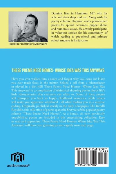 These Poems Need Homes- Who's Idea Was This Anyways Have you ever walked into a room and forgot why you came in? Have you ever made faces in the mirror, fielded a call from a telemarketer or played in a dirt hill? These Poems Need Homes- Who's Idea Was This Anyways? is a compilation of whimsical rhyming poems about life's little idiosyncrasies that everyone can relate to. Some of these poems will transport you back to happy childhood memories, while others will make you appreciate adulthood- all while leading you to a surprise ending. Originally published weekly in the daily newspaper, The Ravalli Republic, this collection of poems spans the first year of the popular poetry column "These Poems Need Homes". As a bonus, six new, previously unpublished poems are included in this entertaining collection. Easy to read and appreciate, These Poems Need Homes- Who's Idea Was This Aynways?, will have you grinning as you eagerly turn each page.