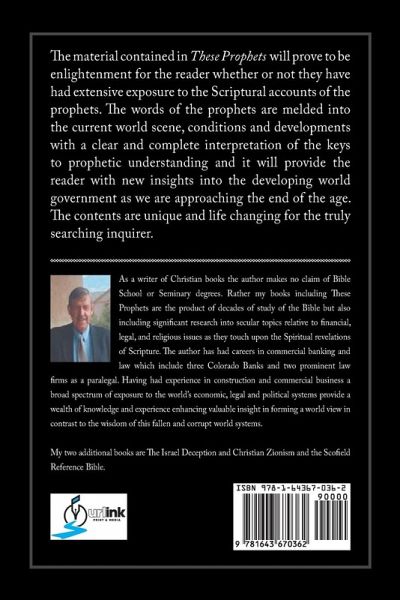 The material contained in These Prophets will prove to be enlightenment for the reader whether or not they have had extensive exposure to the Scriptural accounts of the prophets. e words of the prophets are melded into the current world scene, conditions and developments with a clear and complete interpretation of the keys to prophetic understanding and it will provide the reader with new insights into the developing world government as we are approaching the end of the age. The contents are unique and life changing for the truly searching inquirer.
