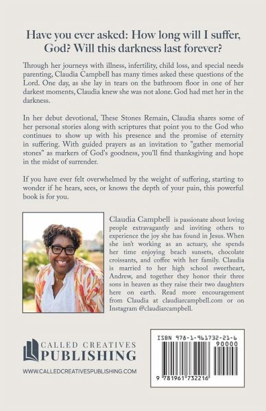 Have you ever asked: How long will I suffer, God? Will this darkness last forever? Through her journeys with illness, infertility, child loss, and special needs parenting, Claudia Campbell has many times asked these questions of the Lord. One day, as she lay in tears on the bathroom floor in one of her darkest moments, Claudia knew she was not alone. God had met her in the darkness. In her debut devotional, These Stones Remain, Claudia shares some of her personal stories along with scriptures that point you to the God who continues to show up with his presence and the promise of eternity in suffering. With guided prayers as an invitation to "gather memorial stones" as markers of God's goodness, you'll find thanksgiving and hope in the midst of surrender. If you ever felt overwhelmed by the weight of suffering, starting to wonder if he hears, sees, or knows the depth of your pain, this powerful book is for you.