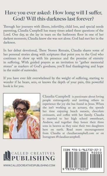Have you ever asked: How long will I suffer, God? Will this darkness last forever? Through her journeys with illness, infertility, child loss, and special needs parenting, Claudia Campbell has many times asked these questions of the Lord. One day, as she lay in tears on the bathroom floor in one of her darkest moments, Claudia knew she was not alone. God had met her in the darkness. In her debut devotional, These Stones Remain, Claudia shares some of her personal stories along with scriptures that point you to the God who continues to show up with his presence and the promise of eternity in suffering. With guided prayers as an invitation to "gather memorial stones" as markers of God's goodness, you'll find thanksgiving and hope in the midst of surrender. If you ever felt overwhelmed by the weight of suffering, starting to wonder if he hears, sees, or knows the depth of your pain, this powerful book is for you.