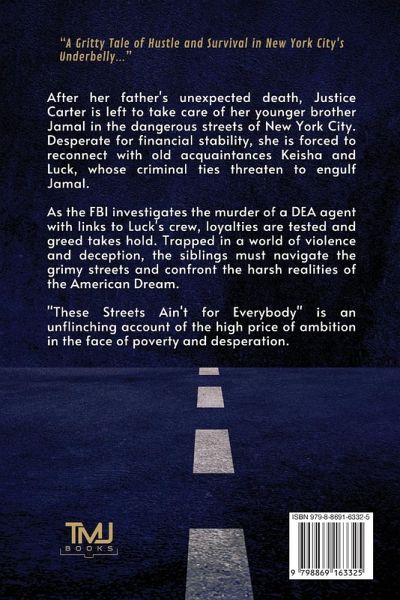 "A Gritty Tale of Hustle and Survival in New York City's Underbelly..." After her father's unexpected death, Justice Carter is left to take care of her younger brother Jamal in the dangerous streets of New York City. Desperate for financial stability, she is forced to reconnect with old acquaintances Keisha and Luck, whose criminal ties threaten to engulf Jamal. As the FBI investigates the murder of a DEA agent with links to Luck's crew, loyalties are tested and greed takes hold. Trapped in a world of violence and deception, the siblings must navigate the grimy streets and confront the harsh realities of the American Dream. "These Streets Ain't for Everybody" is an unflinching account of the high price of ambition in the face of poverty and desperation.