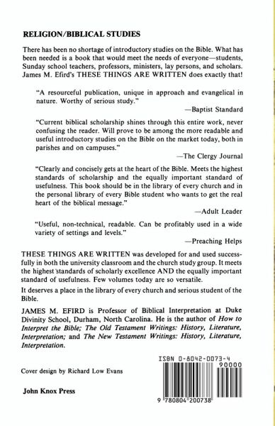 "These Things Are Written" was developed for and used successfully in both the university classroom and the church study group. It meets the highest standards of scholarly excellence "and" the equally important standard of usefulness. This book deserves a place in the library of every church and serious student of the Bible.