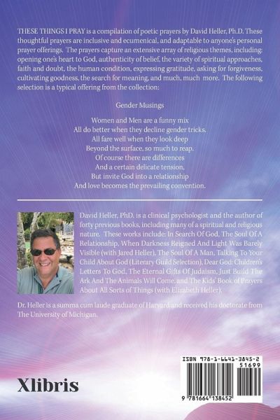 THESE THINGS I PRAY is a compilation of poetic prayers by David Heller, Ph.D. These thoughtful prayers are inclusive and ecumenical, and adaptable to anyone's personal prayer offerings. The prayers capture an extensive array of religious themes, including: opening one's heart to God, authenticity of belief, the variety of spiritual approaches, faith and doubt, the human condition, expressing gratitude, asking for forgiveness, cultivating goodness, the search for meaning, and much, much more. The following selection is a typical offering from the collection: Gender Musings Women and men are a funny mix All do better when they decline gender tricks. All fare well when they look deep Beyond the surface, so much to reap. Of course there are differences And a certain delicate tension, But invite God into a relationship And love becomes the prevailing convention.