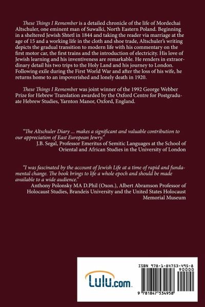 "TheseThings I Remember" describes the life of a learned man in a religious Jewish environment in Northeast Poland. Imbued from early childhood with a deep love of learning, he marries at 15 then makes a career in the cloth and leather trades. His yearning for the Land of Israel takes him there twice to buy land for the people of his town.When his fourth son absconds from the Tsar's army and ends up in London, the father brings him a bride all the way from Poland - detailing his impressions of a foreigner's visit to London. He returns to Poland, is caught up in WW1, goes into exile and is caught up in the revolution. Back in Poland the whirlwind of the First World War and the Russion Revolution wreak havoc on this man's life leaving him to die in poverty. This book sheds extraordinary light on on Jewish life in the Pale of Settlement and on the reasons for the mass exodus of Jews to Western Europe, to America and to Palestine."