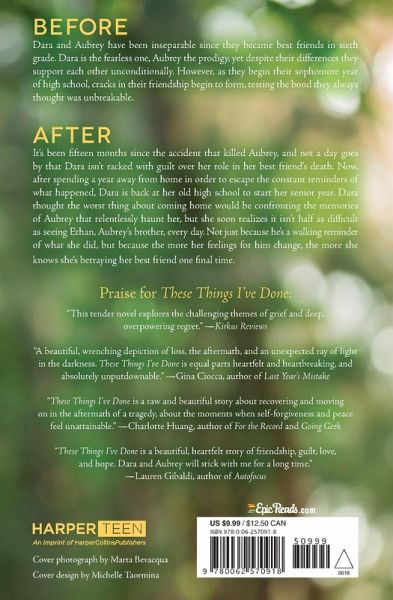 A haunting and beautiful YA novel that is perfect for fans of Courtney Summers and Jessi Kirby, These Things I've Done is the story of a seventeen-year-old girl who accidentally caused her best friend's death and, a year later, is still grappling with the consequences. "A beautiful, wrenching depiction of loss, the aftermath, and an unexpected ray of light in the darkness. These Things I've Done is equal parts heartfelt and heartbreaking, and absolutely unputdownable." --Gina Ciocca, author of Last Year's Mistake "These Things I've Done is a raw and beautiful story about recovering and moving on in the aftermath of a tragedy, about the moments when self-forgiveness and peace feel unattainable. Dara's journey through this struggle is compelling and deeply affecting. Her story will stay with readers long after the last page." --Charlotte Huang, author of For the Record and Going Geek BEFORE: Dara and Aubrey have been inseparable since they became best friends in sixth grade. Dara is the fearless one, Aubrey the prodigy, yet despite their differences, they support each other unconditionally. However, as they begin their sophomore year of high school, cracks in their friendship begin to form, testing the bond they always thought was unbreakable. AFTER: It's been fifteen months since the accident that killed Aubrey, and not a day goes by that Dara isn't racked with guilt over her role in her best friend's death. Now, after spending a year away from home in order to escape the constant reminders of what happened, Dara is back at her old high school to start her senior year. Dara thought the worst thing about coming home would be confronting the memories of Aubrey that relentlessly haunt her, but she soon realizes it isn't half as difficult as seeing Ethan, Aubrey's brother, every day. Not just because he's a walking reminder of what she did, but because the more her feelings for him change, the more she knows she's betraying her best friend one final time.