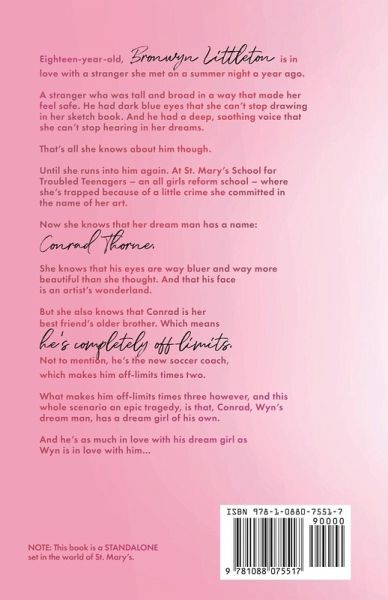 Eighteen-year-old, Bronwyn Littleton is in love with a stranger she met on a summer night a year ago. A stranger who was tall and broad in a way that made her feel safe. He had dark blue eyes that she can't stop drawing in her sketch book. And he had a deep, soothing voice that she can't stop hearing in her dreams. That's all she knows about him though. Until she runs into him again. At St. Mary's School for Troubled Teenagers - an all girls reform school - where she's trapped because of a little crime she committed in the name of her art. Now she knows that her dream man has a name: Conrad Thorne. She knows that his eyes are way bluer and way more beautiful than she thought. And that his face is an artist's wonderland. But she also knows that Conrad is her best friend's older brother. Which means he's completely off-limits. Not to mention, he's the new soccer coach, which makes him off-limits times two. What makes him off-limits times three however, and this whole scenario an epic tragedy, is that, Conrad, Wyn's dream man, has a dream girl of his own. And he's as much in love with his dream girl as Wyn is in love with him... NOTE: This is a STANDALONE set in the world of St. Mary's.