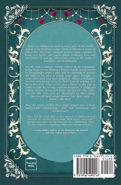 There are children in need in every part of the world and in every fictitious realm-from newborns to teens. In These Ties We Forge, multiple authors come together to bring you stories and poems about resilience, love, and the power of making connections even in the midst of loneliness and detachment. An elf with a unique oddity cowers in an orphanage, losing hope of ever finding a forever family. Being chased by Darkbringer ships, a pilot will do anything to protect the baby in his care. A young single mom struggles to make ends meet and faces judgment. When a firefighter receives devastating news, he finds himself holding new life in his arms. Time travel takes a father to the past in order to right his wrongs with his daughter. A young girl collects flowers from each home and person who comes into her life. Two girls are abandoned by their village because of their unique powers, but their story doesn't end there. May the words within these pages inspire you to forge unbreakable relationships that can transcend any circumstance.