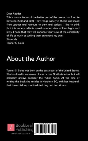 ""Dear Reader This is a compilation of the better part of the poems that I wrote between 2010 and 2021. They range widely in theme and mood from upbeat and humours to dark and serious. I like to think that this variety reflects a well rounded view of life's highs and lows. I hope that they will enhance your view of the complexity of life as much as writing them enhanced my own. Sincerely Tanner S. Soles""