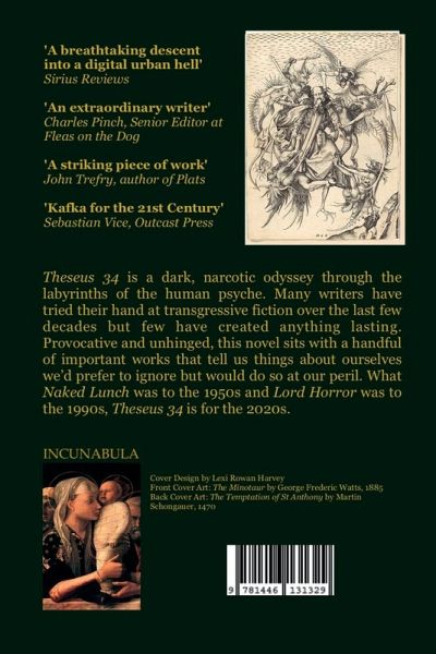 Theseus 34 is a dark, narcotic odyssey through the labyrinths of the human psyche. Many writers have tried their hand at transgressive fiction over the last few decades but few have created anything lasting. Provocative and unhinged, this novel sits with a handful of important works that tell us things about ourselves we'd prefer to ignore but would do so at our peril. What Naked Lunch was to the 1950s and Lord Horror was to the 1990s, Theseus 34 is set to be for the 2020s.