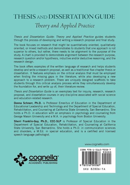 Thesis and Dissertation Guide: Theory and Applied Practice guides students through the process of developing and writing a research proposal and final study. The book focuses on research that might be quantitatively oriented, qualitatively oriented, or mixed methods and demonstrates to students that one approach is not superior to others, but rather, there needs to be alignment to the purpose of the study. A chart is provided to demonstrate alignment between the research purpose, research question and/or hypothesis, inductive and/or deductive reasoning, and the research design. The book offers examples of the written language of research and helps students develop and write a research proposal, as well as a traditional five-chapter thesis or dissertation. It features emphasis on the critical analysis that must be employed when finding the missing gaps in the literature, while also developing a new approach to a research problem. There are uniquely designed scaffolds to take students through this critical analysis process while they simultaneously develop the foundation for, and write up of, their literature review. Thesis and Dissertation Guide is an exemplary text for inquiry, research, research proposal, and dissertation courses in any discipline associated with social science and education-related research.