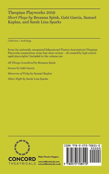 From the nationally recognized Educational Theatre Association's Thespian Playworks competition come four short scripts - all created by high school-aged playwrights! This volume includes: All Things Considered by Breanna Spink Ismene by Gabi Garcia Memories of Vichy by Samuel Kaplan Silent Night by Sarah Lina Sparks