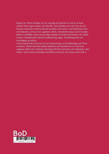 Boken om Thess handlar om en ung tjej och hennes liv och är skriven utifrån Thess egna tankar och känslor. Hon berättar om vem hon är och hennes intressen, med en känsla av allvar och humor. Hon beskriver fram och baksidor och hur hon upplever sitt liv, i beroende skap av LSS insatser. Boken innehåller bland annat några kapitel med lite information om Adhd, Autism, Intellektuell funktionsnedsättning, lagar, förhållningssätt och överklagan av beslut. I kommande bok, kommer en kort beskrivning av fortsättningen på Thess situation. Sedan kommer boken beskriva och handla om hur man kan uppleva rollen som anhörig. Anhöriga till Thess kommer att medverka i den boken. Även andra anhörigas berättelser kommer att finnas med i bok 2.