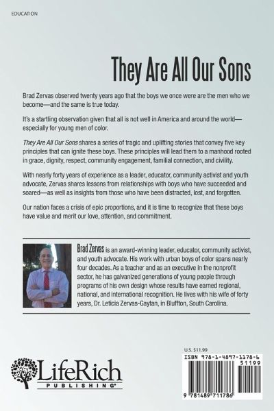 Brad Zervas observed twenty years ago that the boys we once were are the men who we become-and the same is true today. It's a startling observation given that all is not well in America and around the world-especially for young men of color. They Are All Our Sons shares a series of tragic and uplifting stories that convey five key principles that can ignite these boys. These principles will lead them to a manhood rooted in grace, dignity, respect, community engagement, familial connection, and civility. With nearly forty years of experience as a leader, educator, community activist and youth advocate, Zervas shares lessons from relationships with boys who have succeeded and soared-as well as insights from those who have been distracted, lost, and forgotten. Our nation faces a crisis of epic proportions, and it is time to recognize that these boys have value and merit our love, attention, and commitment.